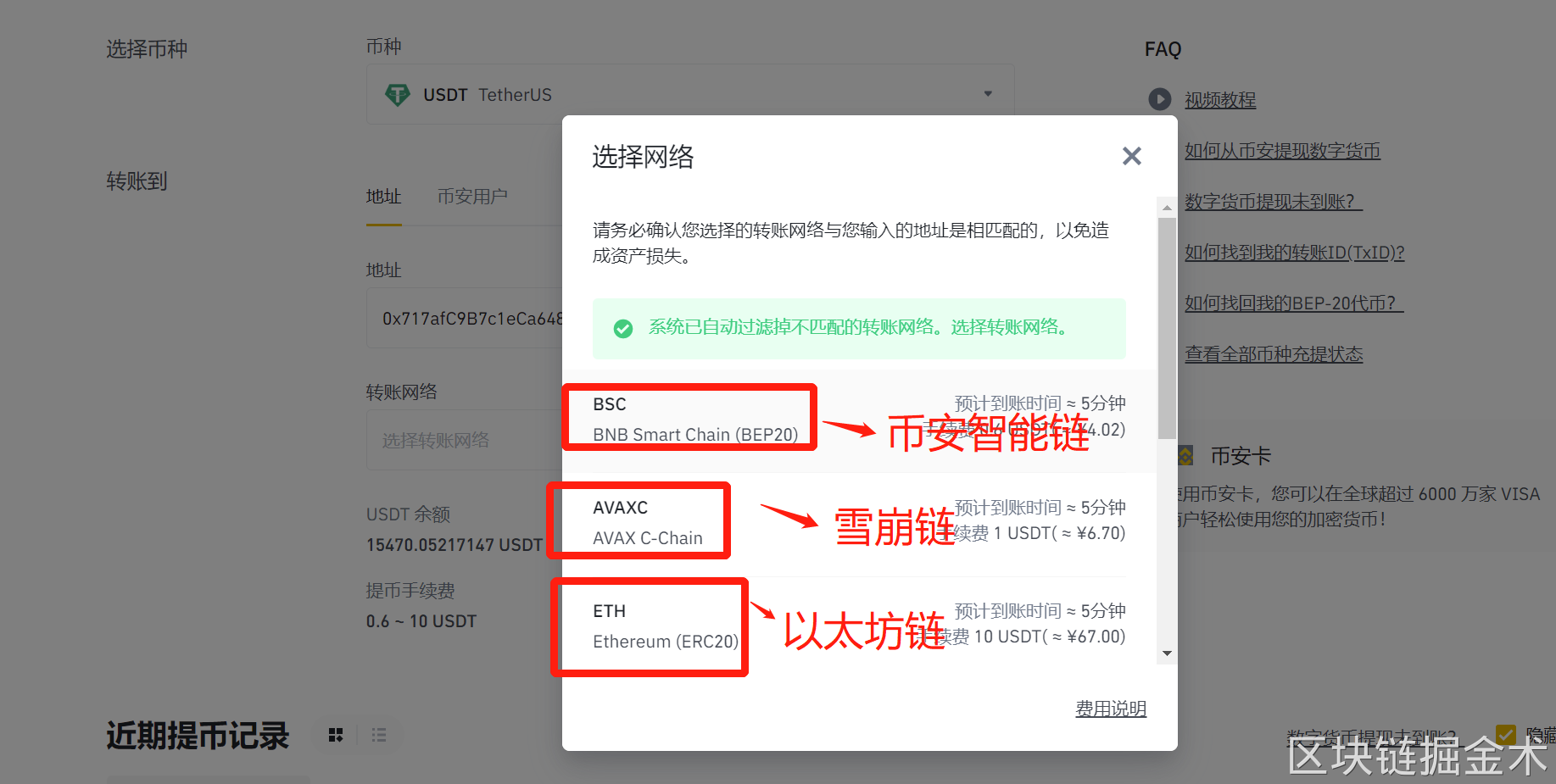 接下来选择您要把USDT提到那条链上去,比如提到BSC或者BEP20网络就是币安智能链,AVAX就是雪崩链,ETH就是以太坊链