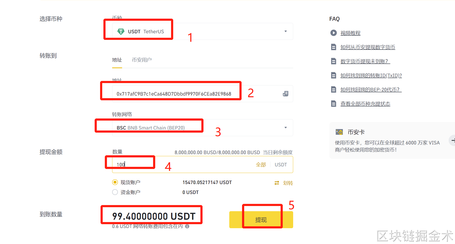 最后,我们假设提到币安智能链上,提100U,点击确认,按照下面这张图片的步骤就可以把资产提过去了