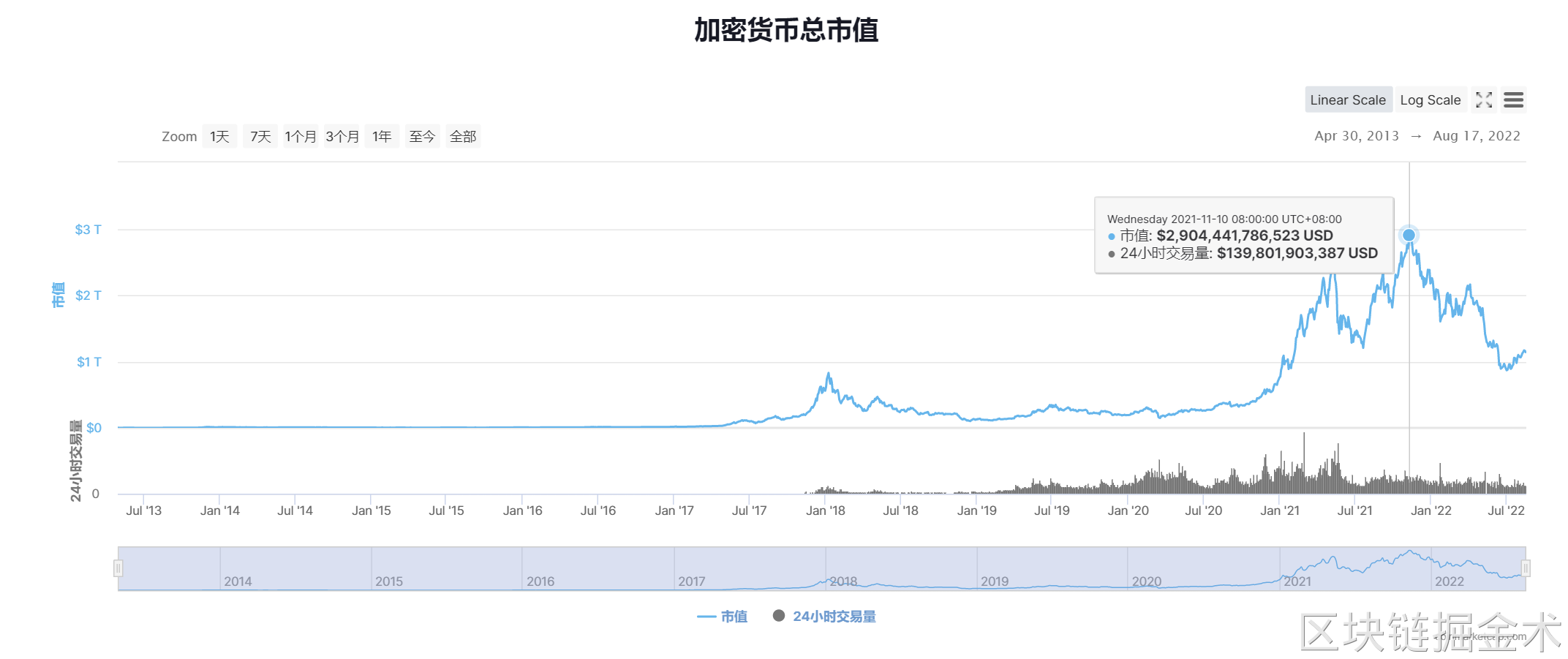 为了让你有一个宏观的了解加密市场,我们给您介绍一下加密市场的市值有多少,目前加密市场有1.1万亿的市值,在2021年11月全球加密市场的总市值突破2.9万亿,从2008年10月31日中本聪开始发布白皮书的那一天开始,经历了13年,加密市场迎来了一个爆发式的增长,一个万亿市值的行业还是值得您花一点时间了解的,毕竟这个行业才刚刚开始,如果和互联网的发展路径相比,目前的加密市场还相当于2000年左右的互联网,大多数人还不能明白互联网到底是什么